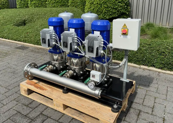 - Industriële watervoeding op speciaal frame, ten behoeve van opslagruimte tussen twee funderingspalen, met volledige Hydro-Unit ® drukverhogingsinstallatie (export Qatar).